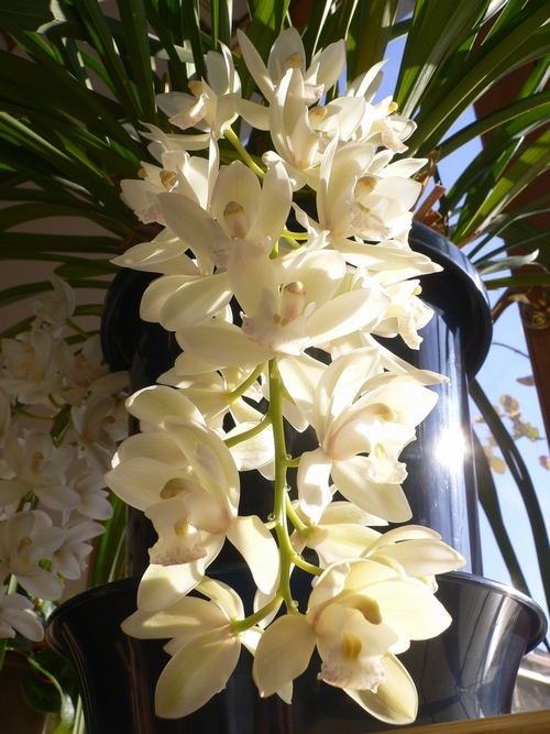 Here, Flower of Cymbidium is open fully, gorgeously, At center of white flower, small pnk spot appears, with a lot of small flower in fully open. Still bearing many budds, for a while, we can expect.