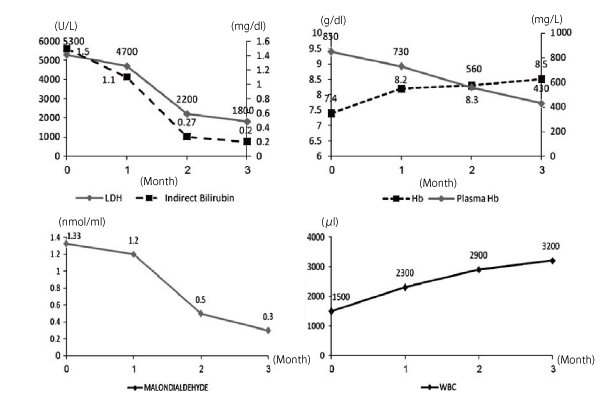 FPP supplied as sachets, containing 3 g powder, by Osato Research Institute, Gifu, Japan, was given three times daily for 4 months. Following FPP therapy, Hb level increased by 1 gr/dl, WBC to 3,200 per microliter, and all the hemolytic parameters have been significantly improved (Fig.). Malondialdehyde levels, a product of lipid membrane peroxidation, were significantly decreased-which may reduce its mutagenic and leukemogenic effect. The patient was symptomatically improved, with less fatigue and better performance.